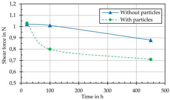 When determining the adhesive force, the influence of the growing Cr2O3 layer on the hardness of the layer described above was demonstrated (Figure 18). In samples with particle loading, a clear and continuous reduction of the adhesive strength can be observed, as the grown Cr2O3 layer became more porous and cracked with increasing annealing time. Conversely, the adhesive strength of samples without particle loading hardly decreased. The reason for this can be considered to be the influence of graphite particles on the diffusion process of the components of the Cr2O3 layer from the base material.