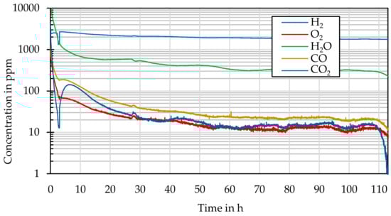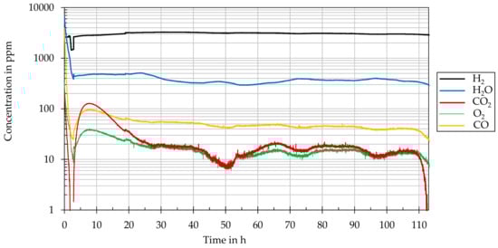 Because of the complex chemical reactions between the substrate and the layers formed on the surface, no negligible gaseous reaction products are released. The main reaction partners are impurities in the coolant helium. The change in concentration was recorded in the ppm range and is shown in Figure 12.