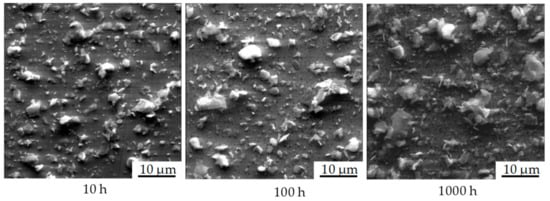 In comparison with the alloy Alloy 800H considered so far, individual graphite particles could still be detected on the substrate surfaces after analogous tests with the nickel-chromium-based alloy, Inconel 617. Figure 13 shows the surfaces captured by SEM. Already after 10 h, the formation of a Cr2O3 passivation layer is visible. This self-protection process of Inconel 617 under HTR conditions has already been described in detail [9,23].
