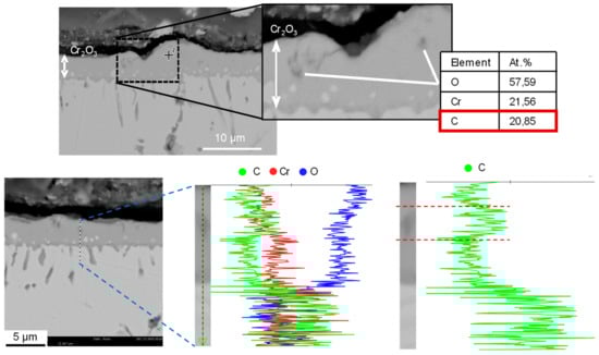 An examination of the micrograph shows that no formation of intermetallic phases took place for this purpose (Figure 14). However, a time-dependent increase in the geometric dimensions of grain boundaries can be observed, as described in the literature [24]. According to EDX mapping, the Cr required for the formation of the Cr2O3 passivation layer was depleted in the near-surface structural area. It can be observed that the graphite particles formed a solid bond with the substrate. The reason for this could be the affinity of diffusion of the carbon into the material along the newly formed grain boundaries. This was confirmed by EDX point measurements. In addition, it can be observed that Ti was depleted in the near-surface grain boundaries, which again indicates the formation of TiC. It can also be observed that graphite particles were embedded in the Cr2O3 passive layer.