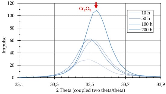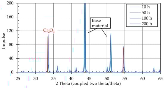 The measurements using XRD show that the formation of the crystalline structure in the form of Cr2O3 clearly outweighs the formation of other structures (Figure 15). Figure 16 also shows the time-dependent growth of chromium oxide.