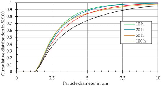 By detecting the particles present, it could be observed that the number of particles on the sample decreased by up to 10% with increasing time. This mainly concerned small particles below 2 µm. It was also shown that the geometric diameter of larger particles (>dP50) was reduced (Figure 17). In addition to embedding in the passivation layer and diffusion into the boundary layer, the conversion of graphite to CO or CO2 can be seen as the reason for particle reduction.