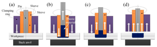 Schematic of refill friction stir spot welding (RFSSW): (a) clamping stage, (b) plunging stage, (c) retreating stage, and (d) finishing stage.