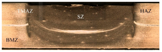In order to study the microstructural characteristics in different zones of the RFSSW joint in detail, the RFSSW joint was divided into four microstructure zones, i.e., base material zone (BMZ), stir zone (SZ), thermo-mechanically affected zone (TMAZ), and heat-affected zone (HAZ), according to the previous studies on FSSW [16,17,18,19]. The different zones are marked in Figure 3.