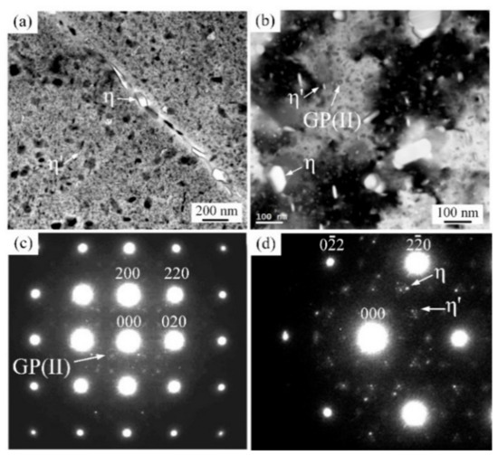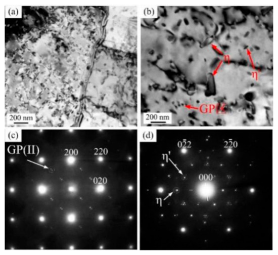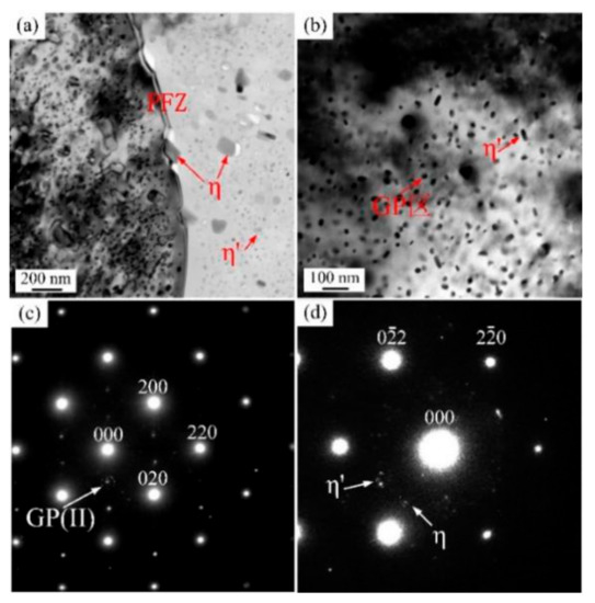 The HAZ only experiences welding thermal cycle without plastic deformation. Thus, no dislocation can be detected in this zone (see Figure 8a,b). According to the results of SAED as shown in Figure 8c,d, the precipitates in the TMAZ can be defined as the GP (II) zones, η’ and η phases. The average sizes of these precipitates are 18 nm, 45 nm and 160 nm respectively. In addition, 70 nm width PFZ can be also observed. All the sizes of the precipitates and PFZ in the HAZ are increased compared with the BMZ. This is a typical characteristic of overaging of aluminum alloy caused by the welding heat input.