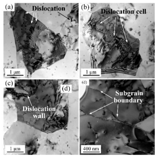 Dislocations and recover structures in the stir zone (SZ): (a) dislocation multiplication, (b) dislocation cells, (c) dislocation wall, and (d) sub-boundaries.