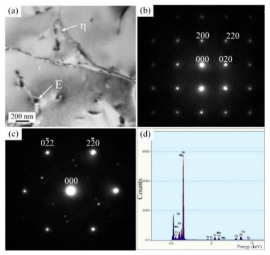 The precipitates are shown in Figure 6. After welding, the stable η particles with typical rod shape can be observed in the SZ, as shown in Figure 6a. The results of SAED along [001]Al and [111]Al show that there are nearly no η’ precipitates or GP zones in the SZ (see Figure 6b,c). This indicates that nearly all the η’ precipitates or GP zones are dissolved into the matrix under the high welding heat input, and only the large η particles are remained. It is worth noting that the η particles obviously distribute along the dislocations and subgrains boundaries. This indicates that the remained η particles can hinder the migration of the dislocations and subgrains boundaries, and then inhibit the growth of the recrystallization grains. In addition, some spherical like particles can be also observed along the dislocation. In order to determine the spherical like particles, energy dispersive spectroscopy (EDS) analysis was conducted, as shown in Figure 6d. The result shows that Cr element is enriched in the spherical like particles. This is a typical characteristic of E phase (Mg3Cr2Al18) in the Al-Zn-Mg-Cu alloys [22]. It can be seen that the E phase particles can also pin dislocations and subgrains boundaries.