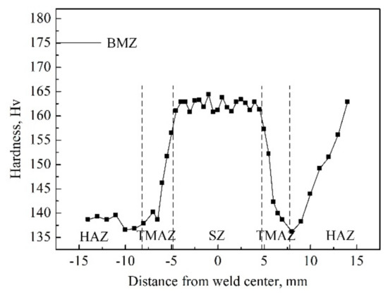 - The HAZ, the TMAZ, and the SZ constitute a soft region in the RFSSW joint. The distribution curve of the hardness values presented an asymmetric “W” shape, and the minimum value located at the interface between the HAZ and the TMAZ.”