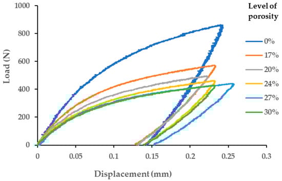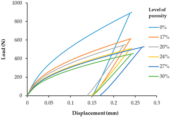Thermomechanical properties of Ni50.1Ti from [41] were used for tuning the UMAT mentioned above. Followed by preparing the FE model, the uniaxial tensile test of the bone fixation plates was simulated. The load-displacement response of the bone fixation plates under tensile loading is summarized in Figure 2. As it is seen in Figure 2, adding different levels of porosity to the bone fixation plates alters the stiffness of the plates and can be used for achieving engineered levels of stiffness. As the next step, the simulated bone fixation plates were fabricated and used for validating the FE simulations.