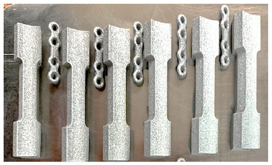 In order to investigate the superelastic response of bone fixation plates, only bone fixation plates with the most complex geometry (minimum thickness = 1.5 mm) and an extreme level of porosity (i.e., 46%) was considered. To create a realistic geometry for the bone fixation plate, a 4-hole 1.5 mm thick bone fixation plate as shown in Figure 5a was provided by Stryker (Kalamazoo, MI, USA). The plate was then scanned using a micro computed tomography (micro-CT), and its CAD model was created (Figure 5b). Using the same methodology explained earlier, the porosity (0.6 mm pore cells) and a covering thin-wall structure (0.2 mm) added to the CAD model (Figure 5c,d). After creating the final CAD model for the porous plate, by following the previous procedure, an FE model for simulating the tensile behavior as well as an STL file for the SLM fabrications was created. In order to accurately characterize the tensile behavior of the Ni50.8Ti bone fixation plates, standard tensile samples were also designed and prepared for fabrication in addition to the bone fixation plates. Figure 6 shows the fabricated bone fixation plates immediately after fabrication and before the support removal procedure. Localized and overall thermomechanical behavior of the standard tensile coupon as well as the bone fixation plates, is discussed in the next section.