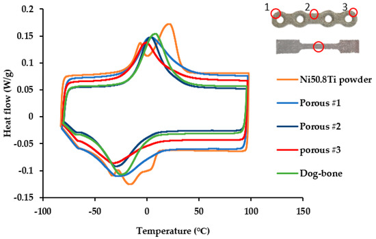 The differential scanning calorimetry (DSC) results of the as-fabricated porous bone fixation plate from three different locations, the dog bone sample, and Ni50.8Ti powder.