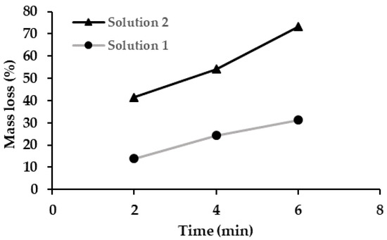 Figure 10 shows the results of the chemical etching process on the mass loss of the samples etched the two trialed solutions. Three bone-plate was etched within the etching solution 1 while three others were etched within the solution 2. The mass loss increased proportionally with the time for both solutions. The results show that the second solution with reduced HF and increased HNO3, removed material at nearly twice the rate of solution 1.