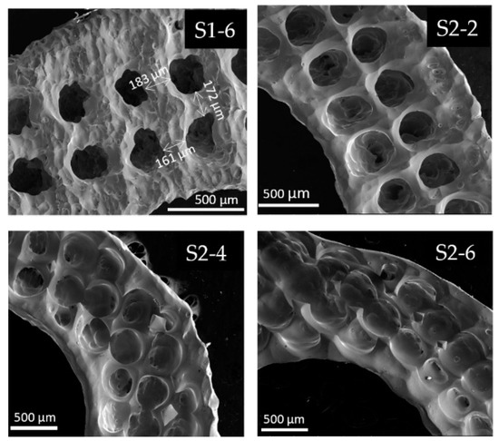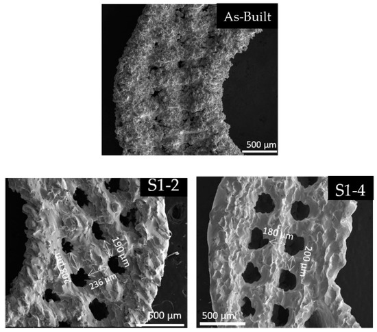 The effect of the etching procedure on the geometry, as well as the surface finish of the samples, is reflected in the SEM images in Figure 11. As it can be seen in the “As-built” sample, excessive un-melted powder is attached to the surface of the as-built sample and almost entirely covered the pores. S1-2, S1-4, and S1-6 show the SEM images of samples etched with solution 1 with the different durations of 2, 4, and 6 min. The un-melted powder was partially removed on S1-2. S1-4 and S1-6 that were submerged for a long time showed the best result of the chemical polishing. In order to make a more accurate comparison on the effect of chemical polishing, the distance between the pores was measured and compared with the original distance on the CAD file. Based on this comparison, the size and geometry of S1-2 had the most consistency with the original CAD model, and therefore it was reported as the optimized polishing procedure. The polishing by solution 2 for 2 min (S2-2) was almost good but still more than required. While the polishing with solution 2 for 4 and 6 min (S2-4 and S2-6) was too aggressive and caused excessive degradation of the pore structures.