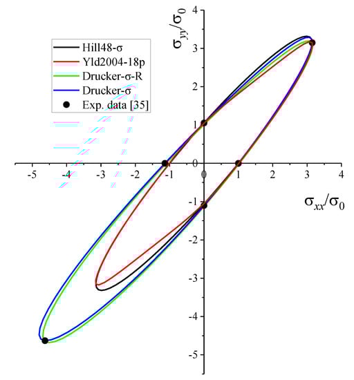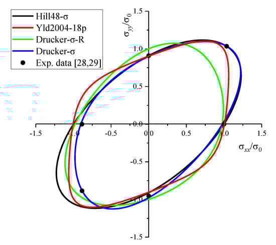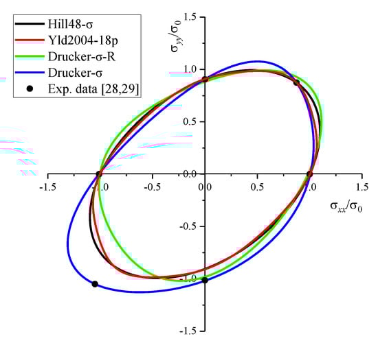 In the paper, two types of Drucker yield functions are selected for comparative study. The one denoted as Ducker-σ-R is determined by Equation (40), while the one named as Ducker-σ is determined by Equation (41). The optimized anisotropic material parameters are listed in Table 6 for AA 2090-T3 and Table 7 for AA 2008-T4. The yield loci constructed by Hill’s 48, Yld2004-18p, two extended Drucker yield functions, and the experimental data points are plotted in Figure 1 for AA 2090-T3 and Figure 2 for AA 2008-T4. The yield surface of Hill’s 48 is symmetric because the function is quadratic of stress components. In the first quadrant, Hill’s 48, Yld2004-18p and Ducker-σ yield functions show quite good coincidence to three tensile yield stresses , and obtained by experiment. Only the Ducker-σ can precisely describe the SDE. The pronounced difference between the yield surfaces denoted as Ducker-σ-R and Ducker-σ reveals attention must be paid when choosing objective functions to optimize material parameters.