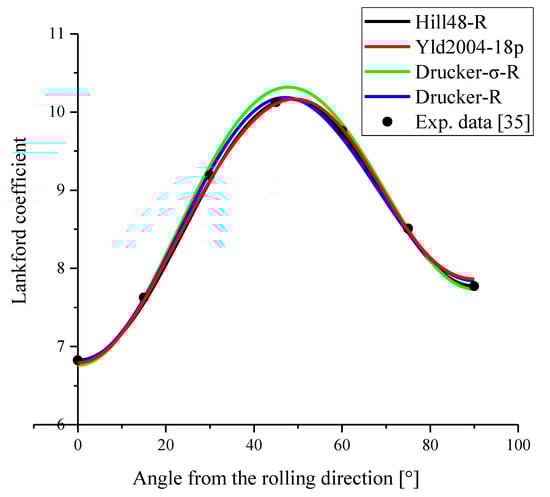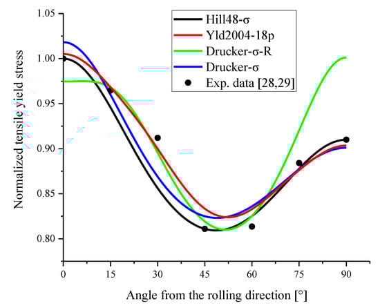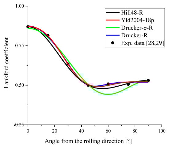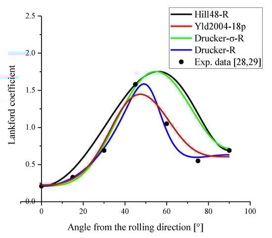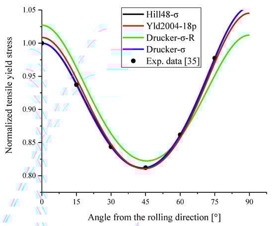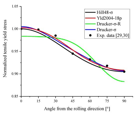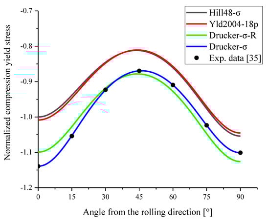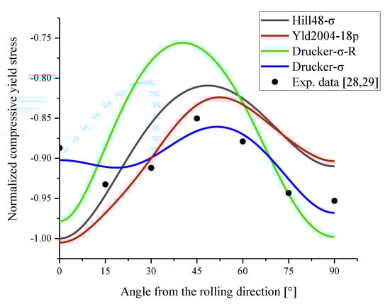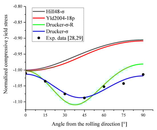 In case of non-AFR Drucker yield criterion, since the yield and the potential functions are individually expressed with stresses and r-values, the yield function parameters are determined merely depending on uni-axial tensile and compressive yield stresses at every 15 degree from the RD (, , , , , , , , , , , , , ) as well as the equi-biaxial tensile yield stress () in Equation (41). Meanwhile, the parameters of the plastic potential are calibrated on the basis of r-values for unidirectional loading in different directions (, , , , , , ) along with the equi-biaxial loading () and one uni-axial tensile yield stress in Equation (42). There are ten parameters under AFR and twenty parameters under non-AFR Drucker yield functions to be determined.