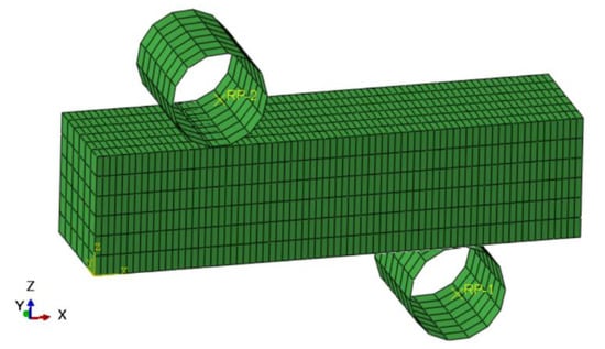 The conditions of the four-point beam bending test, including element size and boundary conditions, were taken from [33,34]. Eight-node hexahedral elements (C3D8R in ABAQUS 6.14/CAE, Dassault Systemes Simulia Corp., Providence, RI, USA) with selective reduced integration are used to discretize the beam, shown in Figure 11. The number of elements along transverse and normal directions of the beam cross-section is six and along the longitudinal direction is 75. There are 2700 finite elements in total, which is the same as the one in Reference [34].