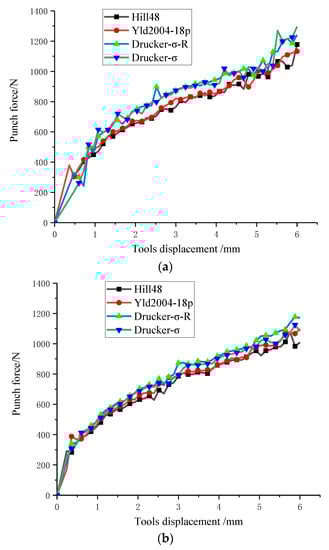 and are two virtue matrix, is a matrix used to transform Cauchy stress coordinate to deviatoric stress coordinate. The material parameters and in Equation (10) disappears because the anisotropy characteristic is represented by the twelve anisotropic parameters (, , …, in and , , …, in ). Eight of these parameters, listed as , , and are used to determine the anisotropy of in-plane plastic deformation. These parameters are calibrated by uni-axial tensile yield stress in different directions as well as the yield stress of the balanced biaxial tensile test (also uni-axial compressive yield stress if available). Since the through-thickness properties are very difficult to be measured for thin steel sheets, the other four parameters are simplified as and .