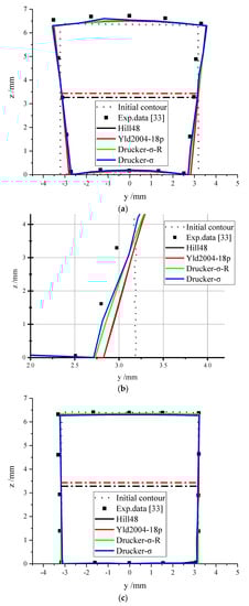 Figure 17 shows the final configurations of the simulated results with various yield functions and superimposed to the experimentally obtained data (black dots) in Reference [33]. Regarding the predicted deformed beam central cross-section, all models predict similar wedge-shaped cross-sections for the TTB case as the hard-to-deform -axes are mostly in accordance with the z-axis. The reason for the wedge-shaped cross-sections is due to a stress state of nearly uni-axial tension at the outmost layer along the beam longitudinal direction (the x-axis) and changing to almost uni-axial compressive stress state from the neutral plane to the innermost layer.