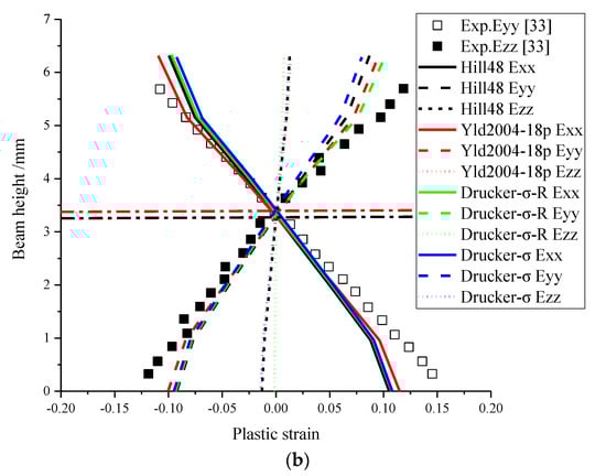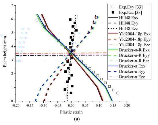Figure 18 shows the strain distributions along the direction of z-axis in the central cross-section and compared with observed experimental data obtained by a local strain measurement method determined by dot-matrix deposition and mapping [34]. Figure 18a is the case of TTB, where all the yield criteria can predict similar plastic strain distributions along the normal orientation of Zirconium plate where the hard-to-deform -axes are predominately parallel to. But for the plastic strain distribution along x-axis, the extended Drucker yield criteria are in better coincidence with observed data, particularly with the increase of the absolute value of beam height. The unbalanced strain distributions lead to the shift of the neutral layer predicted by extended Drucker yield criteria considering SDE.