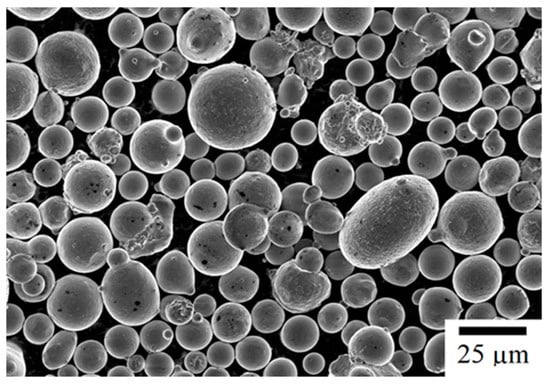 The purpose of the experiments was to compare the erosion resistance of as-SLM specimen (coded AS) with those of the three heat-treated specimens (A, SA, and HSA) under various impact angles. Table 1 shows the SLM process parameters used in this study. The raw material IN718 powder supplied by EOS GmbH (Electro-Optical Systems, Krailling, Germany) had an average particle size of 15 μm (Figure 1). The chemical compositions of IN718 included: Ni (50–55 wt. %), Cr (17–21 wt. %), Nb (4.7–5.5 wt. %), Ti (0.6–1.2 wt. %), Al (0.2–0.8 wt. %), Mo (2.8–3.3 wt. %), Co (≤1.0 wt. %), Cu (≤0.3 wt. %), C (≤0.08 wt. %), and Fe (bal.).