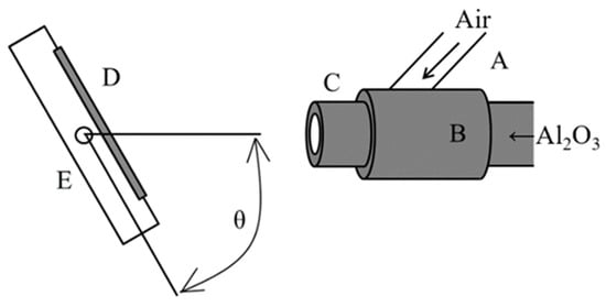 The equipment for particle erosion test. (A: compressed air flow; B: erosion particle (Al2O3) supplier; C: erodent nozzle; D: specimen; E: specimen holder; θ: impact angle.)