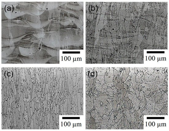 Figure 5 shows the microstructure of the as-SLM Inconel 718 and the three strength-enhanced heat-treated specimens. The as-SLM (AS) specimen has a layered melt pool structure as shown in Figure 5a. Figure 5b shows the microstructure of the specimen “A”. We can observe long grains penetrating the melt pools, while the melt pool traces are inconspicuous because of thermal diffusion. Figure 5c shows the microstructure of the specimen “SA”. The melt pool traces and the dendritic structure are replaced by long grains parallel to the laser direction. This means that after the solid solution treatment, the dendrites decomposed, and the segregated solute atoms dissolved into the matrix to form long recrystallized grains. The microstructure of the specimen “HSA” is shown in Figure 5d. The HSA specimen exhibits passivated equiaxed recrystallized grains. These four microstructures are similar to those mentioned in the literature [19,20,21,22].