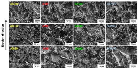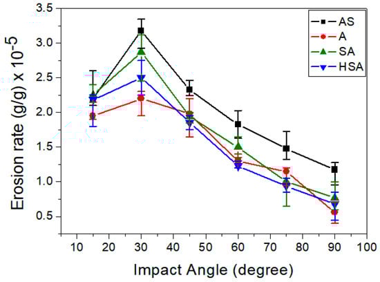 The difference in the erosion rates among the specimens culminated at 30°, and it was significant in the low-angle region (<45°), the domain of ductile domination. The erosion rates from high to low corresponded to AS, SA, HSA, and A. However, in the high-angle region (>45°), the domain of brittle domination, the erosion rates of A, SA, and HSA were similar to each other, and significantly lower than that of AS.