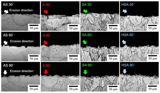 The subsurface morphology of all specimens at 30°, 60°, and 90° are shown in Figure 8. Specimen A had the lowest erosion rate with almost no lips, showing a smoother subsurface morphology. The subsurface morphology of A, SA, and HSA were more undulated. At 60°, AS and A exhibited similar subsurface morphology, with some lip features and oblique pits; SA and HSA were filled with oblique pits without lips. At 90°, narrow and deep pits were observed in AS, while A, SA, and HSA had wider and shallow pits. In addition, extrusion traces after the positively eroded particles were observed in SA and HSA, with the latter one being more obvious.