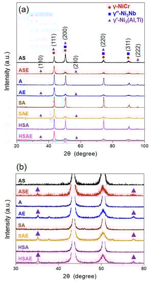 Figure 9 displays the XRD diffraction analysis pre and post positive erosion endured at 90°. For post erosion labeling, we added an ‘E’ after the codes, i.e., ASE, AE, SAE, and HSAE. We can observe five peaks, namely (111), (200), (220), (311), and (222). As the peaks of γ, γ′, and γ″ are almost overlapping, it is difficult to match peaks with phases. The literature [5,25] suggests, to match the (111) peak with the γ phase and the (222) peak with the γ′ phase. The main peaks of A, SA, and HSA appear as (111) peaks, while the (222) peaks are more obvious than in the AS, indicating that the γ′ phase was formed after heat treatments.