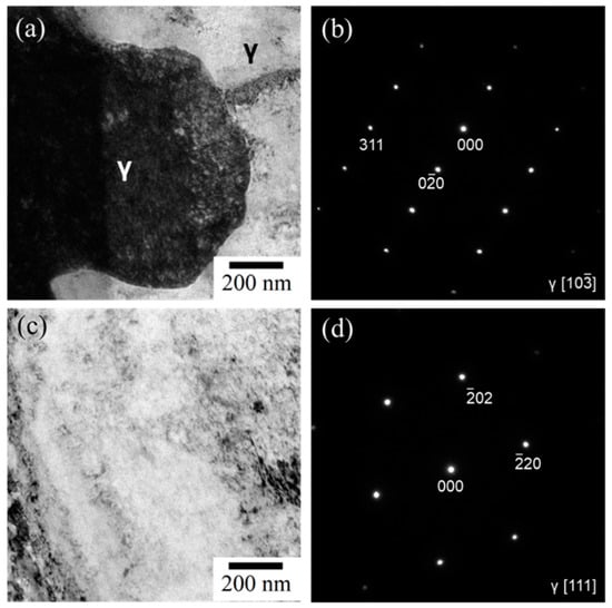 We compared the changes of microstructures of A, AE, HSA, and HSAE between pre and post erosion (AE and HSAE) via TEM. Figure 10a is the bright field TEM image of the specimen A surface region. From the selected area electron diffraction (SAED) pattern shown in Figure 10b, it can be confirmed that the black and the white regions both represent γ phase matrices. Figure 10c displays the bright field TEM image of the surface region of the HSA specimen. The SAED pattern of the white area corresponds a γ phase matrix, shown in Figure 10d.