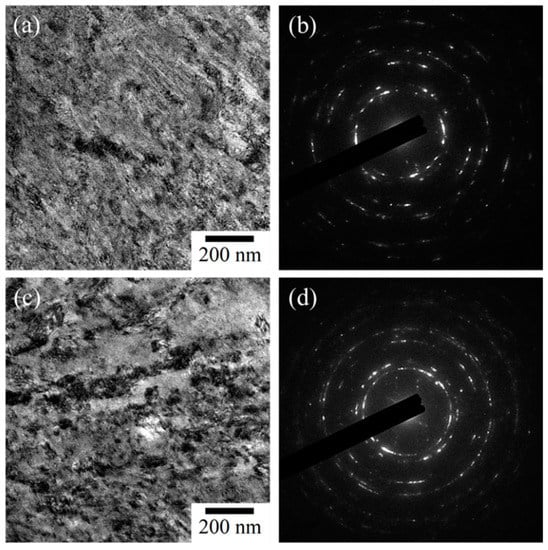 Figure 11a,b shows bright field TEM images of the surface region of AE and HSAE, respectively. The microstructures are completely different after the particle erosion. Figure 11c,d displays the well-defined SAED ring patterns of AE and HSAE, respectively. The fine grains within the region selected indicate that the surface regions of both A and HSA transformed post erosion.