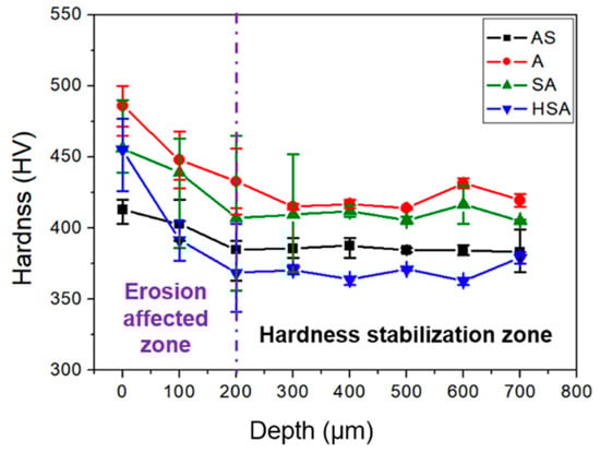 The microhardness distribution along the longitudinal direction of the specimens post particle erosion is shown in Figure 12. After positive erosion, the specimens can be divided into two zones. The erosion affected zone (EAZ) runs from the erosion surface toward the bottom, while the hardness stability zone (matrix zone) being located below the EAZ. At EAZ, microhardness gradually declines from the surface to a depth of 200 μm, where it reaches the matrix hardness stability zone.