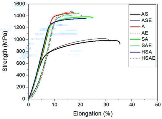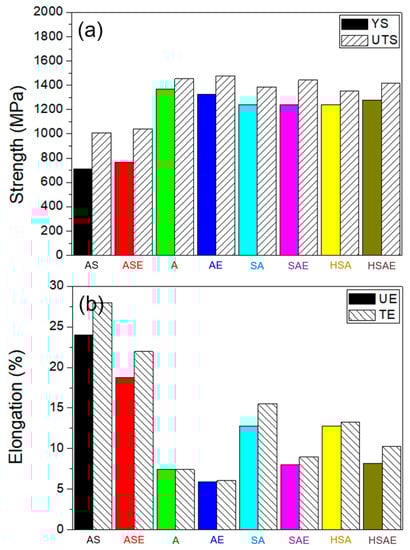 Figure 14 shows the tensile mechanical proprieties of the four specimens pre and post positive erosion at a 90° impact angle. The AS specimen had better ductility (UE close to 30%), but the strength was lower than that in the ASM 5662 standard [26] for direct applicability. The strength obviously increased, and the ductility significantly reduced after three heat treatments. The strength of ASE, AE, SAE, and HSAE were similar to those pre erosions, but ductility is significantly reduced, and embrittlement occurred.