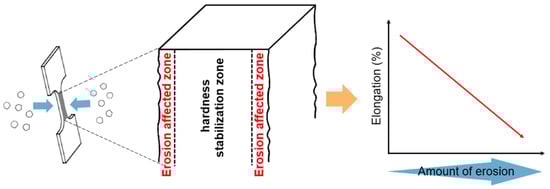 There is a difference between the surface hardness and the stable hardness of the specimens. This difference was maximal in the case of the HSA specimen. Our interpretation is that the HSA specimen had its surface squeezed down and stacked by erosion particles (see Figure 8). The structural evolution of the material after erosion has a significant effect on the tensile mechanical properties of the specimen.