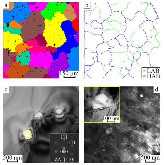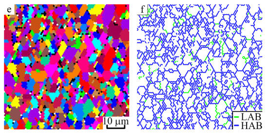 EBSD (electron backscattered diffraction) color-coded grain maps (a,e) and grain boundary maps (b,f), TEM bright-field images (c,d) of V-HNS (high-nitrogen steel) structure after solid-solution treatment (a–c), cold rolling with 50% reduction (d) and cold rolling with anneal at 1050 °C (e,f). EBSD maps in (a,d) corresponded to austenitic phase and were constructed with CI > 0.3. Step sizes were 8 µm (a,b) and 1 µm (e,f). Selected area diffraction pattern in (c) corresponded to the (V,Cr)(N,C) particle (inset in c) and was obtained from the area 0.07 µm2 (marked in yellow circle). LAB—low-angle boundaries, HAB—high-angle boundaries.