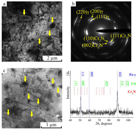 Representative TEM images (a–c) and X-ray diffraction pattern (d) of the microstructure in steel specimens processed via multistep thermal-mechanical treatment: (a,c)—bright-field images. Arrows in (a) and (c) show coarse vanadium nitrides and smaller chromium nitrides in the austenitic structure; b—SAED (selected area electron diffraction) pattern corresponded to the image (a) and obtained from the area 0.3 μm2.