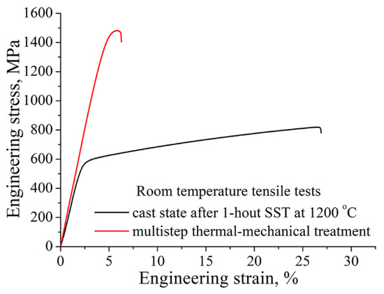 Engineering stress vs. engineering strain diagrams for V-HNS after solid-solution treatment and multistep thermal-mechanical treatment.