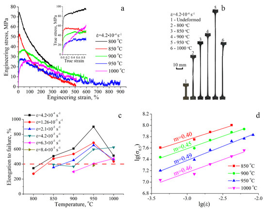 Engineering stress vs. engineering strain diagrams (a) and the photographs of the specimens after high-temperature deformation to failure (b) at strain rate 4.2 × 10−4 s−1. Inset in (a) demonstrates true stress vs. true strain diagrams. Elongation of the specimens processed via thermal-mechanical treatment with dependence on test temperature and strain rate (c) and strain-rate sensitivity coefficient for different test temperatures (d).