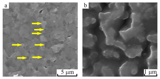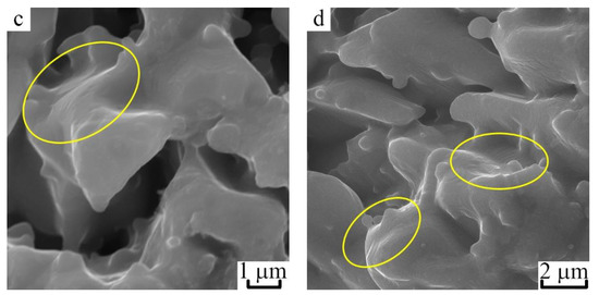 Fractured specimens were homogeneously deformed (Figure 4b). The realization of superplastic behavior in V-HNS during high-temperature tests was accompanied by a formation of characteristic relief on the surfaces of the specimens tensile tested in a vacuum and having polished smooth surfaces before the test. SEM images of the lateral surfaces of the specimens at different values of elongation after the tensile test at 950 °C and the strain rate of 4.2 × 10−4 s−1 are shown in Figure 5. At the early stages of high-temperature deformation (40% and 100% elongation), equiaxial fine grains were clearly visible on SEM images (Figure 5a,b). This relief indicated the grain-boundary sliding mechanism (marked by arrows), which is peculiar for superplastic flow [1,2]. No traces of intragranular slip were observed on the lateral surfaces of the specimens at these elongation values. For the temperature 950 °C, the mean grain size determined from the SEM image in Figure 5a was 0.74 ± 0.15 μm. This testified to the recrystallization and transformation of the deformation-assisted microstructure produced by multistep thermal-mechanical treatment (Figure 2a) into fine-grained microstructure during high-temperature deformation (Figure 5a). The absence of descending stage in true stress vs. true strain diagrams in the early stages of the plastic flow (Figure 4a, inset) evidenced that recrystallization occurred during pre-deformation heat of the specimens up to the test temperature, and the beginning of the plastic flow was associated basically with the grain-boundary sliding mechanism of deformation. The deformation was accompanied by the formation of a specific relief (surface level irregularities) on the surface of the specimens (in Figure 5a,b) that confirmed the prevailing of the grain-boundary sliding deformation mechanism. At higher elongation (400 and 900%), cavities and traces of intragranular slip (shown by yellow contours) could be seen on SEM images (Figure 5c,d).