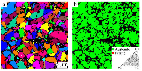 The EBSD phase and structural maps for the working part of tensile specimens after high-temperature deformation to failure at 950 °C and strain rate of 4.2 × 10−4 s−1 are shown in Figure 6. Both round-shaped and slightly elongated grains are seen in Figure 6a. The elongated form of the grains could be associated with a portion of intragranular slip during high-temperature deformation. The average size of austenitic grains in Figure 6a–d was 1.5 ± 1.0 μm. The boundaries in Figure 6c possessed mainly high-angle misorientations, and inverse pole figure (inset in Figure 6b) testified the random orientation of austenitic grains after superplastic deformation at 950 °C. Kernel’s average misorientations inside of grains did not exceed 2° (Figure 6d). These features gave evidence for grain boundary sliding as a dominating deformation mechanism during high-temperature tensile deformation of the specimens.