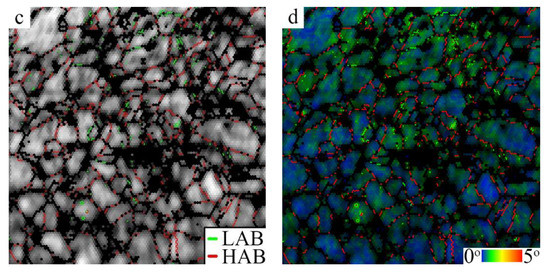 EBSD color-coded maps corresponded to the working part of the specimen after tensile test to 900% elongation at 950 °C and the strain rate of 4.2 × 10−4 s−1: grain map (a), phase map and [001] inverse pole figure for austenitic phase (b), grain boundary map combined with image quality map (c), and Kernel average misorientation map combined with boundary map (d). All maps were constructed for the austenitic phase (normal direction) with CI > 0.3 and step size 0.3 µm. LAB–low-angle boundaries, HAB–high-angle boundaries. The EBSD maps for transverse and rolling directions were similar to maps in (a–d).