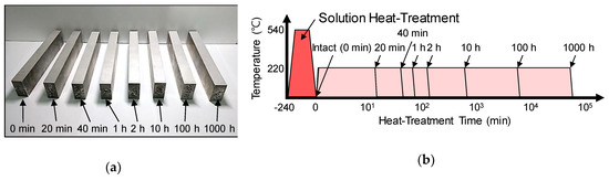 The thermal-aged specimens shown in Figure 1a were cut from an aluminum alloy plate (Al6061) by wire-cut electrical discharge machining (WEDM), under uniform conditions to guarantee the same flatness and roughness of the inspected surfaces. The specimens had dimensions of 20 mm × 38 mm × 200 mm. In order to make the specimens feature gradually differing levels of thermal aging, the heat-treatment was conducted with eight different durations as shown in Figure 1b. Firstly, all the specimens were solution heat-treated for 4 h at 540 °C in a muffle furnace and then water-cooled, which plays an important role in transforming the precipitates of the specimens into the quasi-homogeneous state, by putting the pre-existing precipitating microscopic particles back into the solution. After that, the specimens were heat-treated at 220 °C for eight durations: 0 min, 20 min, 40 min, 1 h, 2 h, 10 h, 100 h, and 1000 h. This resulted in the specimens with eight levels of thermal aging.