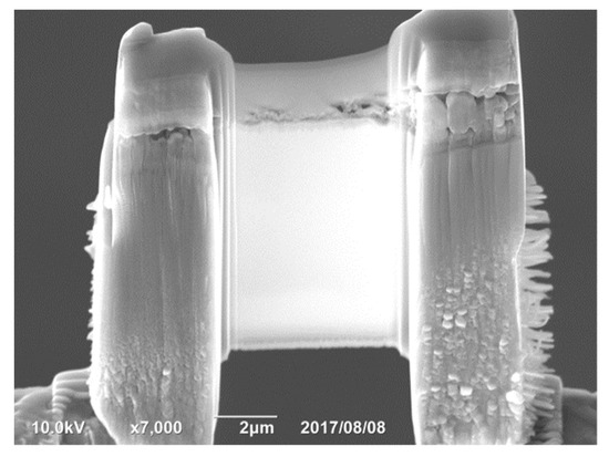 The TEM imaging was conducted, to observe the microstructures of the specimens. The samples for the TEM were cut from each specimen and then polished to 0.1 mm, via a focused ion beam (FIB) process as shown in Figure 2. The polished samples were then punched into be the shape of a disk with 3 mm diameter. The disk-shaped samples were next thinned by twin jet electro-polishing (Tenupol-5, Struers, Willich, Germany) in a 25% nitric acid and 75% methanol solution at −25 °C. The TEM was performed on a JEM-2100F (JEOL, Peabody, MA, USA).