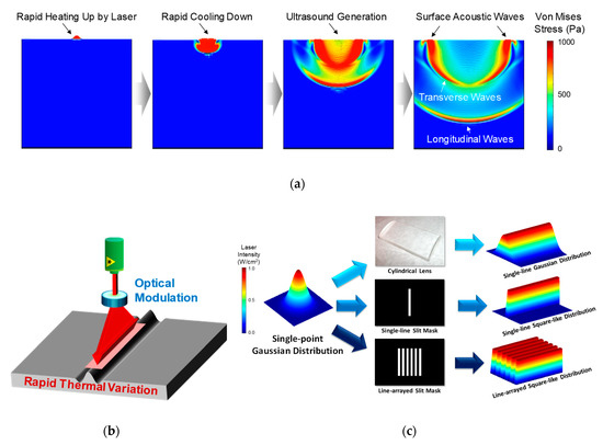 The generation and propagation of ultrasounds due to thermal stress from the pulsed laser shot are illustrated in Figure 3a. When a pulse laser shot is irradiated onto the surface of the target, the laser energy is absorbed into its surface. This induces a heating and cooling of the surface. The rapid thermal variation results in a thermal expansion and contraction of the surface, which creates thermal stresses, as shown in Figure 3b. The thermal stresses generate a SAW which then propagates along the surface [3,4]. The characteristics of the SAW, such as its burst count, fundamental frequency, directivity, and focal point, can be controlled by modulating the intensity distribution of the laser, as shown in Figure 3c.