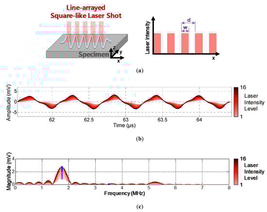 Waveforms of laser-generated SAW of 1.75 MHz and their frequency spectra with respect to the intensity of the line-arrayed square-like laser shot; (a) the intensity distribution of a line-arrayed square-like laser shot; (b) the waveforms of the SAW generated by the line-arrayed square-like laser shots; (c) the frequency spectra of the SAW generated by the line-arrayed square-like laser shots.