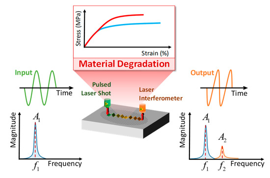 The laser-generated SAW can have different magnitudes of the second-order harmonic frequency component, according to the microstructural state of the material. The second-order harmonic frequency component increases due to acoustic nonlinearity, which is affected by microstructural change while the laser-generated SAW propagates on the surface, as shown in Figure 5. In other words, the microstructural variation can be indirectly detected via the acoustic nonlinearity measurement. Therefore, the acoustic nonlinearity parameter can be a good indicator for evaluating material degradations because the degradations accompany the microstructural changes.