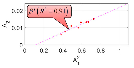 where the relative acoustic nonlinearity parameter is the magnitude of the second-order harmonic frequency component , divided by the squared magnitude of the fundamental frequency component [23,30,31,33].