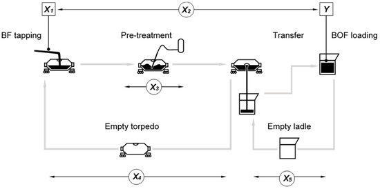 The hot metal process from the BF to the BOF is summarized in Figure 1 and Table 1. Five explanatory variables, Xi, were selected for predicting the final hot metal temperature at BOF, Y. The initial temperature of the hot metal, X1, is measured with disposable thermocouples in the iron runner of the blast furnace during tapping [39,40]. Three measurements are usually taken by cast: Firstly, just after drilling the tap hole; secondly, when the slag arises; and finally, approximately at the end of the cast [5]. Hot metal temperature for each torpedo is calculated by time interpolation between consecutive thermocouple measurements.