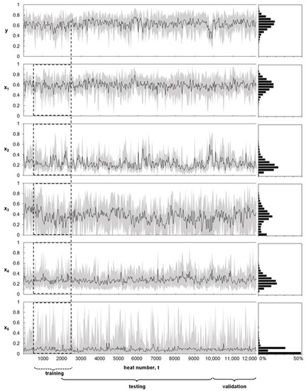Time evolution and histograms corresponding to the six involved variables. The dataset contains 12,195 registers covering one full production year. The first 10,000 heats were used for training and testing while the last 2195 were reserved for final validation. The minimum–maximum interval (gray area) and the average value (solid line) for groups of 30 heats are shown for clarity. The dashed boxes illustrate a moving training window of width w = 2000 for heat number t = 2500.