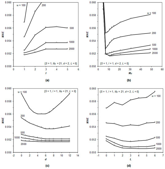 Finally, Figure 4 shows the effect of the most significant hyperparameters (MF, d, and w) when L = 4. It can be seen that the incorporation of four lagged observations not only improves MAE but also makes it less dependent on the other hyperparameters. For w = 2000, any MF > 15 gives the lowest MAE of 0.0506. Similarly, for w = 2000, any d ≥ 2 gives also the minimum MAE. It can be concluded that any model configuration within {S = 1, I = 1, MF > 15, d ≥ 2, L = 4, w = 2000} gives the best results.
